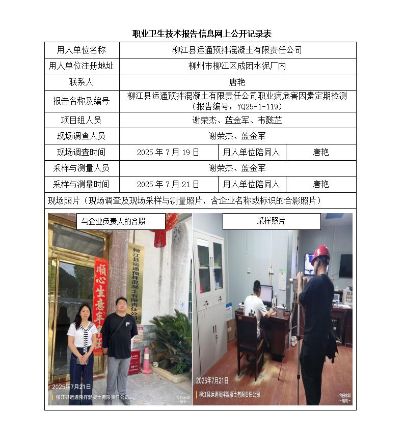 柳江縣運(yùn)通預(yù)拌混凝土有限責(zé)任公司職業(yè)病危害因素定期檢測